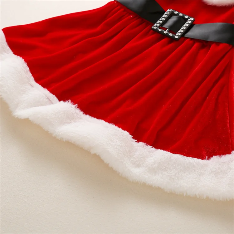 Otroška božična obleka iz mehkega pliša je zelo primerna za decemberske dni, praznična fotografiranja.